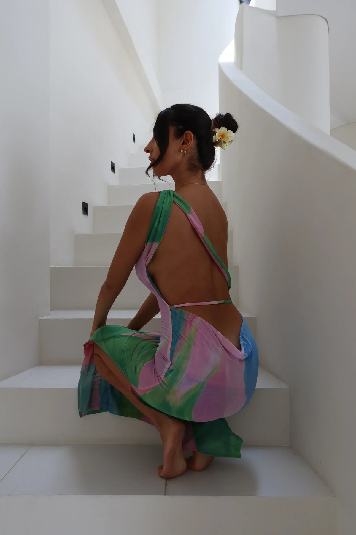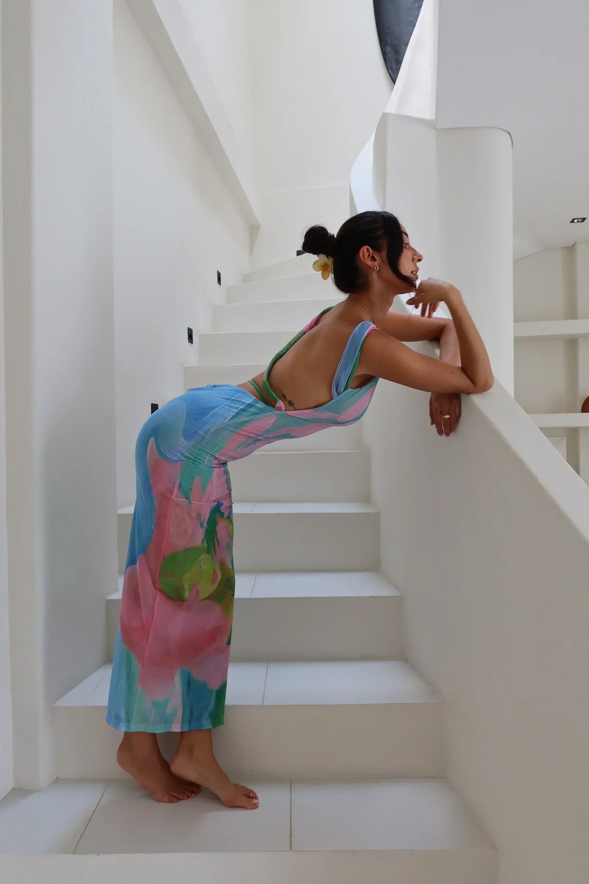 Jessica Midi har en elegant blouson-hög hals och en åtsittande midja som framhäver din figur. Klänningen sträcker sig till en sid slits och har en djup öppen rygg med färgglada detaljer, vilket ger en lyxig twist på en klassisk silhuett.